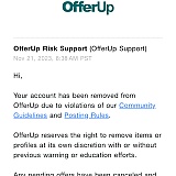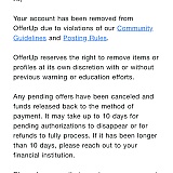 After years of advertising the product and selling I was canceled because I violated their guidelines they said cause I posted a hide rock for a getcko which I seen tons of people selling animals n pets stuff and I never had a problem until I reported a scammer and someone who threatened me to OfferUp and the next day I was blocked an account deleted, and OfferUp just says, violating selling guidances. That's all they keep saying.