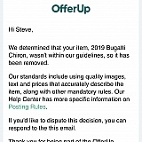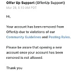 Its no funny u guys deleted my account that i have it for years 187 reviews and my money was pending i never recived. U guys deleted all my data but i have the screen shots and i have my recipts still ill report offert up to bureu business onnline and ill find a way to report it to autorities too. You know trump promised that he will make amazon and ebay to be fear on their agreement. Couse im sure offert up dont have custumer service just to stole money alot people and they dont reply back they cant do nothing about it