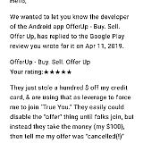 They stole my money and are just hanging on to it! I made an offer on something ($90) for $70 plus $30 shipping. So I get a text some time later from my cc company saying that "Offer Up" took $100 off my card (not a "hold"), so I'm happy cuz I think my offer was accepted, but then all I get from offer up is something saying the transaction was cancelled(!), and they havent issued me a refund despite putting the item back out there for sale and NUMEROUS *ignored* requests! Then they got rid of my review on play store and sent me a "copy" showing I gave them 5 stars! They wouldnt even allow me to ask for my money back or anything unless I join "True You!" Why would I give these thieves more info to harass-market things to me when the transaction is already cancelled?