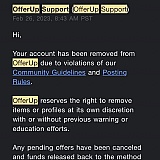 "Your account has been removed from OfferUp due to violations of our Community Guidelines and Posting Rules."