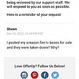 Offerup has NO customer service response. No phone line. Customer support never responds.