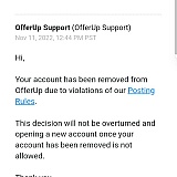 So use OfferUp at your own risk, and don't be surprised when you get a notice of being banned with no detail and without validation.