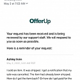I bought to items at the same time that both flopped. I guess they changed there mined and offerup sent me a message that they were refunding me my money I've yet to see it