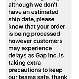 I placed an order on April 16,2020. It said I would receive it in 5 to 8 business days. I know it will take a little longer because of Covid. It is now March 9 my order has not been processed. I cannot contact anybody on their chat or their phone number. I messaged them through Facebook and got generic responses. The last one said they have no shipping date and I have no idea when it will be shipped. I just want my order. And possibly honesty from Old Navy.