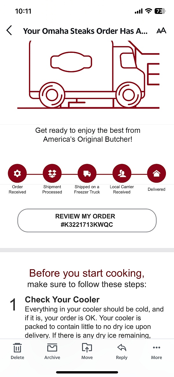 I ordered our main course and desserts from Omaha to be delivered on 11/27/2024 the day prior to holiday. I paid extra for expedited delivery but I felt I should confirm the delivery, when I called I was told no delivery on the 27th but it would be delivered on Dec. 3rd a week after Thanksgiving. I heard nothing from Omaha about the change in dates and if I had not called I would have been expecting my order the day before Thanksgiving and I would have received nothing. I was livid that a company of this size did not email or call or make any attempt to fix their mistake and let us know we would not be receiving our order. I will not trust them again and will give future orders to Kansas City Steaks or Chicago Steaks.