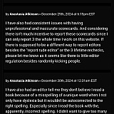 The problem I ran into was how unprofessional and inaccurate a LOT of their editors are. This issue isn't just one editor. They either don't follow the guidelines themselves and count suggestions of rephrasing of a perfectly grammatically accurate sentence as a grammatical error, give extremely low subjective scores, and then only give their full explanation when you point out that they gave you a two-vague sentence explanation. I have had Oxford commas reported as a grammar error when it says, in the guidelines, they shouldn't count as a grammar error. If you have dyslexia, you will get accused of not reading the book because you mixed up a unique name in the book. If you don't describe the events that happen in the book, you get accused of not reading the book, but if you do, your review gets flagged as having spoilers.