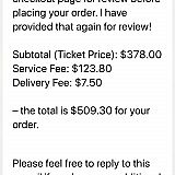 I bought 2 tickets to a musical. The ticket price was $145 per ticket. The total cost was $391. You do the math. I was using paypal and clicked through the screen expecting to see a break out of the cost. There was NOTHING about the fees until I suddenly realized I had gotten to the end and purchased the tickets. I immediately called them with obvious questions. I asked why there were almost $100 in fees for tickets that they didn't even own, they were literally just passing them on from someone else and that Ticketmaster's fees are like half of that. They were rude and dismissive and told me if I didn't want the tickets I could try to find another sucker and resell them at an inflated cost. Paypal was NO HELP and said tickets weren't covered in their "protection". Stay away from this place, they are scammers and PAYPAL is cool with it.