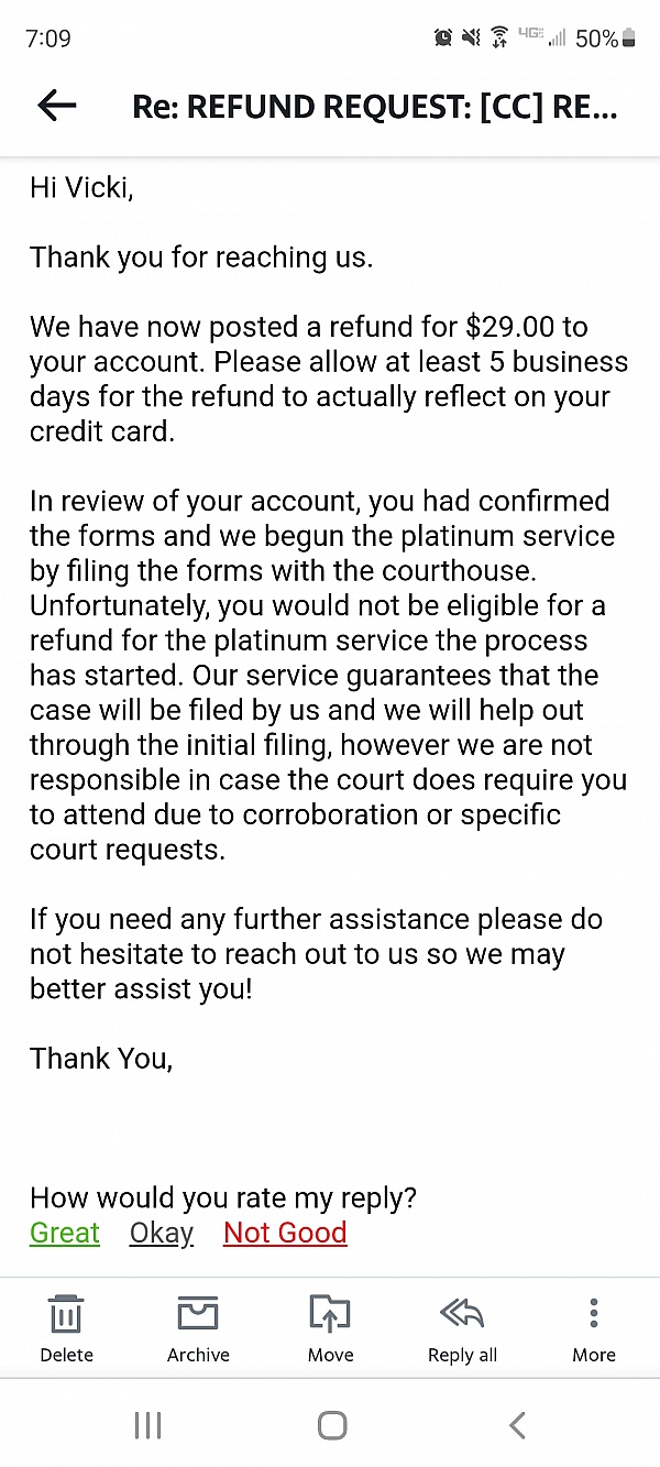 Would not refund my money after shipping me papers and I found out my spouse would not sign— no papers were filed in court yet and they just said "we are sorry" but we cannot give you your money back