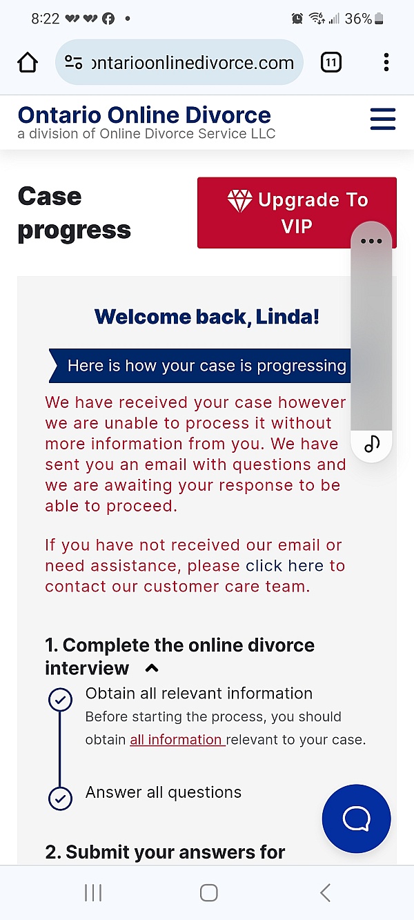 I've been filing for a divorce with them for 2 years! They take their time to process forms, It seems like they wait until ur subscription is renewed monthly before they do anything further. I've had to reach out to them many times to see why isn't my forms being processed. I'm so fed up with Online Divorce, I would not recommend them to anyone