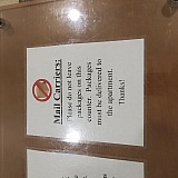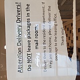 As a delivery person enters the building there is a sign in large font that reads "Attention Delivery Drivers! DO NOT leave packages in the mailroom.