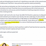 After purchasing a ticket, I received an email from "Melissa" (whose photograph was a stock photo) asking me to purchase the Travel Care Service, and which states the following: