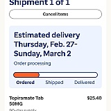 Always have problems ordering from OptumRX. Will order same RX for months and suddenly "under benefit review". Ordered meds on 1/3/2025, Optum delayed order for numerous reasons and provided mixed information on reasons for delay. I missed monthly dosage due to this. Finally arrived 1/21/2025.