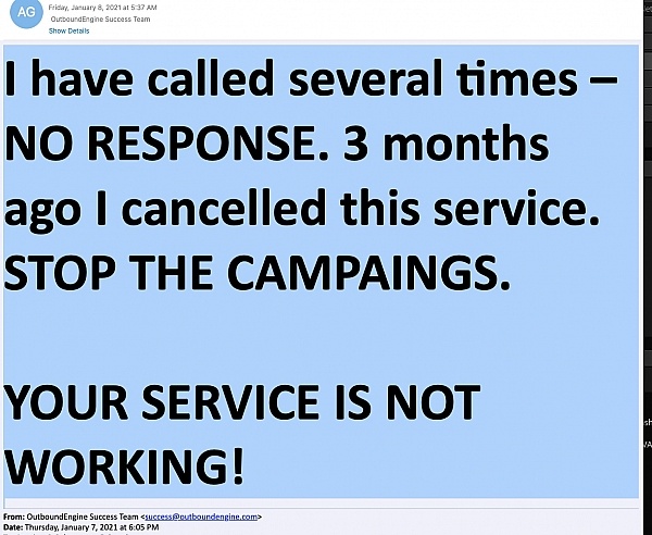 I have used Outbound Engine for a number of years; however, I am not happy with the response rate from my clients and feel it is now the time to end my membership/subscription. I have been told that they will but that I need to speak to one of their managers. They are unavailable every time I call, and then are told they will call me. So far I have waited, for over a month and am still getting billed $329.00. I am on a month-month plan and was told I could stop anytime by giving Notice.