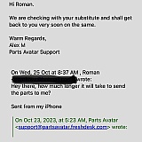 First time from my three previous orders from avatarparts really disappointed with a unrespectable customer service from shipping department by name Alex M.(I waiting 18 days from the day I order the parts, Still not tracking number till today)