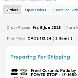 It took a long time to process my order and the last two orders were not packed properly and the boxes the parts came in were damaged.