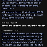 Poor poor business on top of that apparently their employees don't know who their carrier is you will get the only statement I got from my bank was parts geek $35.22 but I sent their part back to him plus I had to pay for shipping back to them but I only got $19.22 back and my person I was talking to on my chat he didn't even know who is Carrie or was but said that $16 was for the carrier fee it was either FedEx or UPS he didn't know but I don't have two different statements on my bank saying $16 for UPS or FedEx and $19.22 for PartsGeek I have one statement parts geek 35.22 but like I said they do not give back taxes or shipping and you have to pay your shipping to return your part so your best bet is keep your part you can sell it for more yourself than to give it back to them yay yay what a business