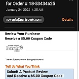 I will never deal with parts geek again. I have always purchased from Rock Auto and Summit with absolutely no issues.