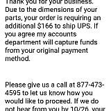 Purchased and paid 350.00 for parts over phone with partzilla phone service. 9 days later I receive email from partzilla telling me they will extract additional 160.00 for shipping from my original payment source... really? I refused to pay more and they cancelled my order. 3 weeks later still no refund received
