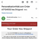 We placed an order on December 9th and paid $30 for rush shipping. On December 10th, we received an email that the order was shipped, and provided us with a tracking number. Throughout the week, the carrier (United Delivery Service) showed they hadn't received the items for that tracking number. I had called Personalization Mall only to get a message that their phones are turned off due to high call volume and I should communicate through email (understandable... it's Christmas in COVID after all). So I emailed them on the 14th asking about the order.