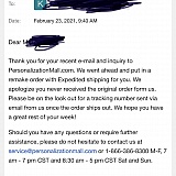 I ordered a blanket on 2/14/21 for my mom's birthday. I paid $16.99 for shipping in order to receive it in her actual birthday which was 2/19/21. The blanket was shipped on 2/17/21. The item arrived in Memphis, TN on 2/19 which is 8-9 hours away from where I live. I contacted customer service via email and they told me the item would be delivered that day. I tried explaining to them that it wasn't possible. I kept reaching out. On 2/23 I received an email that FedEx could now locate the package and I could be sent a replacement. Some how, the replacement was shipped out in less than 10 hours. I was skeptical about that because it is a personalized blanket with 8 names in it. There is still no update on the original item shipped. It's still sitting in Memphis. The replacement is set to arrive on 2/26. I think they could definitely improve their customer service. I've seen so many complaints about this. Waiting to see if I receive the replacement and how it looks.