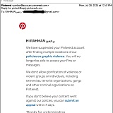 I dmed Pinterest support over 10 times and literally just the same bot messages all over again. My account got banned for "graphic violence". Messaged them even on twitter