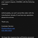 I ordered a faucet from Plumber's Stock for my bathroom that said it would ship in two week. When I went to check on shipping, the site wouldn't recognize my login or email address. I used the text function to reach out to Ann at customer service, who told me that my part was on back order for 6-7 weeks. I asked her to cancel the order because my bathroom would be finished by then. Yesterday, I was charged for the faucet. Now no one is responding to the text chat and a bot is responding to my emails with irrelevant info. I guess I'll have to do a chargeback?