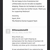 After returned from deployment overseas I was able to open a package from Pokemon center. They sent me a booster box that was completely beat up. Once I started going through the box every pack was bent and curved. There was even a single card pack in there! I contact customer service and they say the curve is from water weather and there's nothing they can do… weather! What?! I've never had cards like these, and from weather come on. They quickly close my ticket and don't even mention the single card pack. Be careful of their absolute terrible customer service. They don't care about you, just the money. I'll never purchase from them again