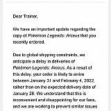 I also in good faith pre-ordered Legends: Arceus because I wanted the Arceus plush bonus gift. Alas, delayed so didn't receive it for release day. Have not received shipping confirmation for it either. Will wait and see on that I guess.