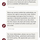 8 Emails, I was finally answered with a downright lie! Never addressed my 3 Emails concerning canceling my order. Poshmark is totally inept and unprofessional. A truly Buyer Beware company! Avoid them like the bubonic plague!