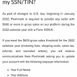 Why is Popshmark adding shipping and their fee's into the seller's 1099-K? According to the information provided on Poshmark sellers account. Poshmark is asking sellers to provide SS# or Tin # or EIN #. It reads: " As part of changes to US law, beginning in January 2022, Poshmark is required to provide any seller with^600.00 or more gross sales on our platform during the 2022 calendar year with a form 1099-K. If you meet the $600 gross sales threshold for the 2022calender year(including fees, shipping cost, sales tax, refunds, and canceled orders) you will revived communications from Poshmark asking you to update your account with the following information: