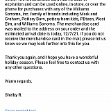 If ordering furniture, be aware they use a separate delivery company and there's no communication. If there's an issue, good luck. Customer service sends you on a merry-go-round of calls. Every time you talk to a new agent and they have to read the notes and usually say the last agent did something wrong. I ordered the Soma Brady sectional back in June and was charged in July. They attempted delivery in Aug but clearly one of the sections of the couch was missing and they tried to deliver a different couch that didn't even match. Their customer service attempted at least 5 different replacement but by Dec, still no couch and no eta. And good luck getting a refund - they can't seem to figure it out. I'll probably have to call my credit card company. All in all, I've spent countless hours on the phone with pottery barn and still no refund, no apology, no one trying to make it right. Absolutely terrible experience.