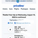 I took a trip via Priceline to Bali. Unfortunately due to a flight delay of the airlines my trip got rerouted. I got sent an email saying I should check in to the airlines but nothing about my return flight getting completely canceled. On the day of my return flight I was notified of this, gratefully I was able to get on standby from Bali to LA thanks to the agents at Singapore airlines. I would hesitate to book a ticket through Priceline again due to the lack of communication. Go directly through the airlines Priceline was really vague and it made for a very stressful trip back from a very beautiful place..