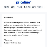 Absolute SCAM corporation! They sold me auto collision insurance for a rental vehicle on the Priceline website and when it came time to pickup my rental vehicle, the company told me they don't honor 3rd party insurance from Priceline. I called Priceline, explain the situation and requested a refund to which I was told it was nonrefundable! If Priceline was a person, this would be considered a crime (obtaining money under false pretenses), but since it's a scumbag corporation, it's just bad business. I attached the email response I received from Priceline customer care admitting and confirming my complaint. Hopefully this will help prevent further criminal acts from Priceline to their unknowing consumers.