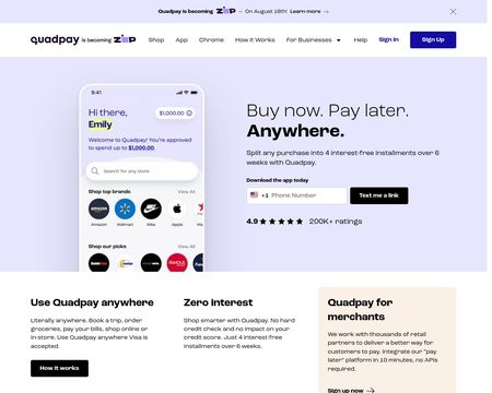 Quadpay is an ok payment platform, does not seem to offer an fair amount on the payment platform. I have been buying and paying with Quadpay on time all payments (sometimes even sooner than when it's required) and I am still at the current limit (no increase) -- I have written to Quadpay and you get customer service (probably not even in the USA) and they don't seem to know how to handle the email's they receive and takes time for response. Quadpay is an ok payment option but it could use some work. They have now announced that Zip is acquiring Quadpay and I hope they will work more closely with customers and offer more limit increases, and more compassion for your customers because without us going out and purchasing everything you would not be in business. I think many companies need to realize that fact. So this I could not give 5 stars for many reasons but I hope with the new Zip format they can improve many options for loyal customers.