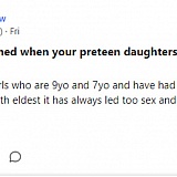 At first, when I joined Quora, it wasn't that bad of a website. It seemed like just any ordinary place for people to ask questions and answer them. Well, here lately, things have taken a great turn. I've gone down a few rabbit holes on Quora and have found really disturbing questions such as people asking if it's normal for daughters to have sex with their Dads, and Mothers to have sex with their sons. I'd find pedophiles replying to these questions, admitting that they have sex with their underaged daughters and how it's an acceptable activity every Dad should try out.