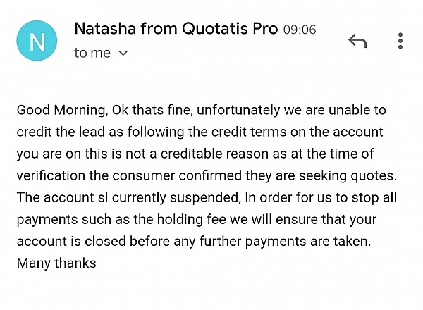 Thank you for your review and I'm sorry that you didn't have a great start with your leads. As seen in your message with the customer, they have asked questions regarding their boiler, therefore they were a genuine customer at the time of their enquiry. We will always strive to help our customers achieve a good cost of sale; usually companies on the Quotatis directory see a 1 in 4 to 1 in 5 conversion rate. I'm sorry that the account hasn't worked out for you this time but please don't hesitate to get in touch again in the future.