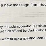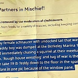 I have 2 miniature schnauzer dogs. A friend sent me a link to R/schnauzers on the Reddit site. I don't go in for 'cutesy social media', but I had to admit, the schnauzers that were being posted on Reddits R/schauzers were doggone cute. I would receive one email/posting per day. After a couple of weeks, I thought what the heck, I'll post 3 pictures really funny pictures and included a short 'description' of my crazy schnauzers. (see attached incl. Removal notice) Immediately, I mean within seconds after uploading the pics and submitting the description I received the RED FLAG message that my posting was being removed. Removed? It never made it to the R/schnauzers 'site'. I sent a copy of my posting and the removal notice to several friends. They suggested I contact the site. I copied the posting in my email and yes, I did say that the moderator(s) had to be 'obtuse' for taking such an action. I don't regret saying that one iota. However, the moderator who sent the snide LOL reply stated they used an 'automoderator and that I could f-off and (I should) be glad he/she didn't ban me. If it was automoderator, then the live moderator who replied to me might have said, 'yeah, you're right, the automoderator can be obtuse at times... sorry about that.' Look, I'm 71 years old and have never been told to f*ck off. Ever. I live in San Francisco and I really, really want to look a Reditt 'representative' down on Market Street in the eyes and ask, 'is this how you want your &@#! Company represented?