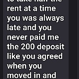 He let me slide on paying half the deposit and I over payed by a week on the last month I stayed there. He refused to pay my deposit back and claims I stole hair dryers from him. I don't have hair.