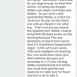 Day of the trip she is suppose to be there at noon to sit more with the dog and get more use to. She doesn't show up. I text her what is going on she said she stopped by for a bit and she was fine (which was a lie because we have a door monitor and no one unlocked or opened the door). She says she will be back there at 3:00 pm. She doesn't get there until about 6. No more communication until the next day, when she tells us she lost the dog. We drive 9 hours to an airport and fly 8 hours to NYC then drive 4 hours home. We find the dog after a few days of searching.