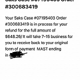 I ordered with saks and they sent me the wrong item, my item was $295 dollars and they sent the complete wrong item. I called them they told me it was nothing they could do except issue a refund in which case i had to go to fed ex mail off the incorrect item back to them then wait for them to receive it then wait up to another 10 days for them to issue a refund. As i waited for a mistake that was made on THEIR part, the item that i originally ordered sold out in my size and they have nothing to say except this is their return policy.