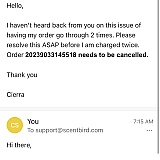 I originally had a subscription that was never delivered to me for 2 months. They didn't respond to my emails (only way to contact), and so I emailed them again to let them know I would be cancelling and disputing through my CC company and they sent me the instructions to cancel. I also ordered sample sized scents and my order duplicated somehow. I have sent them 5 separate emails and have disputed through PayPal now. These people are crooks and impossible to contact. I Guess this is how they make their money. Lesson learned.