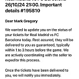 Da ich sowieso in Madrid sein würde pochte ich darauf, die Karten ausgeliefert zu bekommen falls sie nicht weiterverkauft würden. Der angebliche Auslieferungstag 4.10.24 ging vorbei es kam nichts, sollten spätestens am nächsten Morgen 5.10.24 da sein. Mein Flug nach Madrid ging morgens 9:40h. Böse Kommunikation hin und her und die Drohung wenn ich Mittags in Madrid ankomme und die Tickets sind nicht ausgeliefert sollten die sich diese sonst wo reinschieben. Ich sollte mich nicht aufregen, die Tickets würden da sein. Waren sie natürlich nicht!….auch nicht um 14h. Über WhatsApp wurde mitgeteilt, dass sie 1-3 Stunden vor Spielbeginn 21h kommen würden. Da Einlass ab 19:30h war, fuhr ich gegen 18:30h zum Stadion. Den ganzen Nachmittag über WhatsApp mit denen kommuniziert und meinen Frust abgeladen….zwischen 20-21h alle 5 Minuten die vollgemüllt mit bitterbösen WhatsApp Nachrichten (alleine schon um den Vorgang zu dokumentieren). Um 21h die letzte Nachricht geschickt mit ICH WILL MEIN GELD ZURÜCK!
