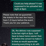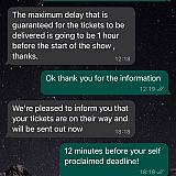 The tickets were due to arrive online one day before the concert by 8pm (Mika in Paris on 25th March), and did not arrive. I contacted the help desk, which was very robotic and did not directly answer my questions. I wrote to say that they had missed the deadline to give me the tickets (8pm the night before), and that i would have to buy other tickets separately instead (bearing in mind that they have to be printed out and i have to travel to the venue). With 1h13min to spare before the concert STARTED, they uploaded tickets to the website and therefore will not issue a refund. I could not use these tickets because they couldn't be printed off in time. I have complained already on the whatsapp chat (which basically did not acknowledge my complaint), and on their website via email (and have not heard back here yet).