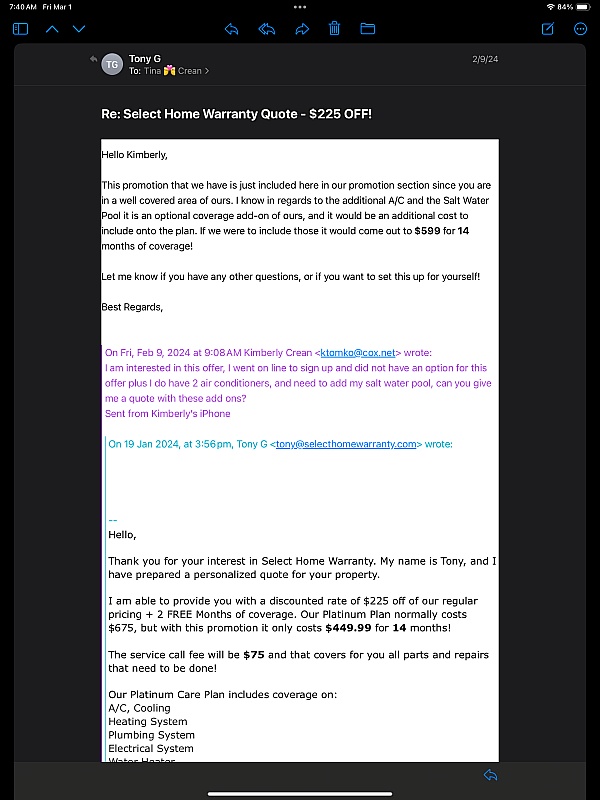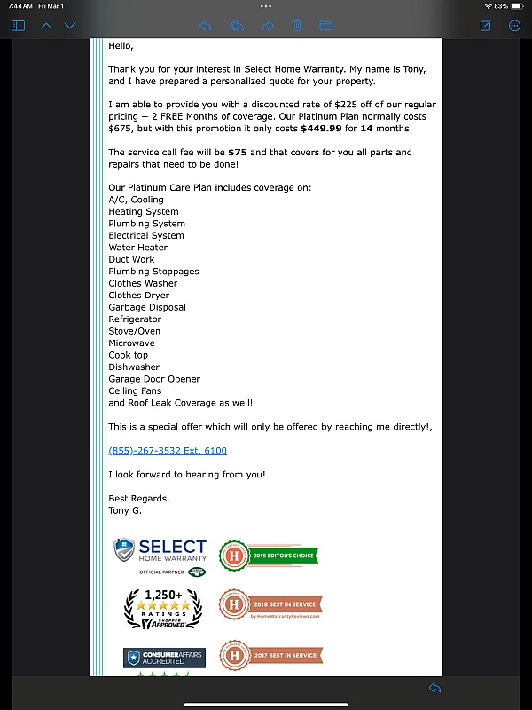 Select Home Warranty has been extremely disappointing. In three years, we've filed four claims, and every time coverage was denied—either the parts or the labor wasn't covered. On top of that, their customer service is outsourced overseas (Philippines), and there is no way to escalate issues beyond the first representative. This company does not stand behind its promises. I do not recommend Select Home Warranty.
