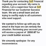 Self is the worst! Had this a acct for a few years. Let them convince me into getting the self credit card. Which they take ur own money that you save up and add to credit card. And after a year when ur saving is done you don't get ur money back. They don't even put ur full saving on ur credit card and they slso start charging you high interest rate on the self credit card that's ur own money you save up on. Credit card balance wound up bring way more then it saving that you never get back! Don't do it trust me self is a compete rip off! They pitch that craptgst they out here to help you build ur credit but they out here doing more damage to it! A waste of time and money!