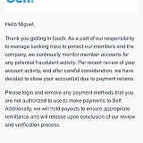 DO NOT OPEN AN ACCOUNT! THEY ARE CROOKS AND HAVE NO SECURITY. MY ACCOUNT WAS HACKED LOG_IN AND EMAIL CHANGED AND MONEY TRANSFERRED FROM MY BANK TO A NEW BANK THEY ADDED TO MY SELF ACCOUNT. I DECIDED ILL JUST CASHOUT THE $1,300 AND WAS TOLD I WOULD GET MY CASH IN 10-14 BUSINESS DAYS. IT HAS BEEN OVER A MONTH. THEY NOW DEMAND IUPLOAD MY PHOTO ID AND PHOTO OF MY SELF CREDIT CARD TO CLOSE MY ACCOUNT WHICH I DID OVER AND OVER AGAIN YET THEY STILL ASK ME. I FEEL LIKE THEY BLOCKED MY NUMBER FROM CUSTOMER SERVICE INQUIRIES BECAUSE THEY SAY THERE IS A WAIT TIME ON THE PHONE OF 20 OR 30 MINUTES AND I HAVE WAITED UP TO 2 HOURS BEFORE REALIZING NO ONE WOULD ANSWER SO I HUNG UP. I HAVE RECENTLY WENT OVER COMPLAINTS OF THIS COMPANY AND SEE THIS IS A COMMON PRACTICE AND THEY DON'T ALWAYS PAYOUT AT END OF TERM OR WHEN REQUESTED. I HAVE NO HOPE IN GETTING MY CASH BACK NOR MY GIRL FRIEND WHO I STUPIDLY REFERRED TO SELF. HOPE THIS HELPS YOU GUYS AND HURT SELF'S BUSINESS. SCAM AT IT'S BEST!