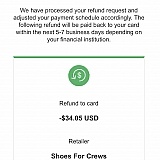 I ordered shoes that were just awful, I used afterpay (a company through shoes for crews) you have to call both companies to get any answers since they don't seem to speak to each other. Between the two of these companies they are only refunding a partial credit. I paid two payments of 24.49 each I should be getting back $50 instead I'm getting back $34. Absolutely awful businesses between the two of them. Would never EVER buy from either again.