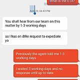 I asked him when they will be reached out for an outcome, ETA but the same response 1-3 working days again. I have requested to put me through a manager, he closes my chat instead.