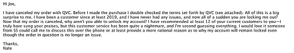 I had to reach out to them to ask why I couldn't get into my account and then they said I had made a bunch of purchases and they suspected I was a reseller. I quickly told them that I was buying for gifts for family and since the deals were buy two get one free I kind of had to buy a lot. They then took two weeks to tell me I violated their terms. They couldn't tell me what exact terms because I read through all of them and I didn't do anything to violate their terms.