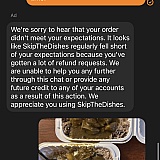 Skip the dish are untrustworthy and unreliable and they don't have a proper customer service. Their drivers are not keen on making sure that they delivered the order.my last 2 orders are not delivered and they promised a refund which I never received. They are liars and steal our money.